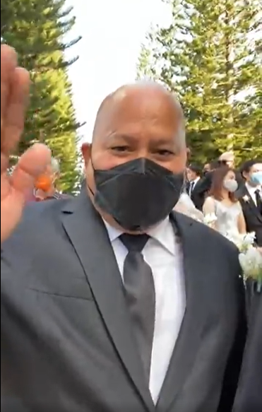 Senator Ronald “Bato” dela Rosa, PDP-Laban standard bearer, at the wedding of wedding of of Senator Bong Revilla’s daugher Gianna Revilla and Jed Patricio in Silang, Cavite on Nov. 11, 2021. (Screenshot of Facebook Live post of Sen. Bong Revilla Jr. on Nov. 11, 2021 during the wedding of his daughter, Gianna Revilla. Courtesy Facebook page of Sen. Bong Revilla Jr)