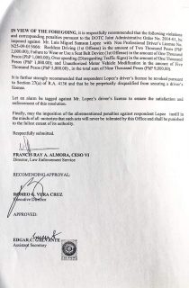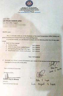 Based on the copies, Lopez himself received on June 6 a copy of the LTO resolution that also revoked his current driver’s license, and slapped fines ranging from P1000 to P5000 against him.