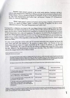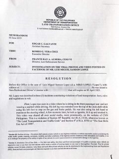 (Eagle News)–These pictures show a copy of the pages of the Land Transportation Office resolution that perpetually barred Luis Miguel Lopez, also known as Miko Lopez, from securing a driver’s license.