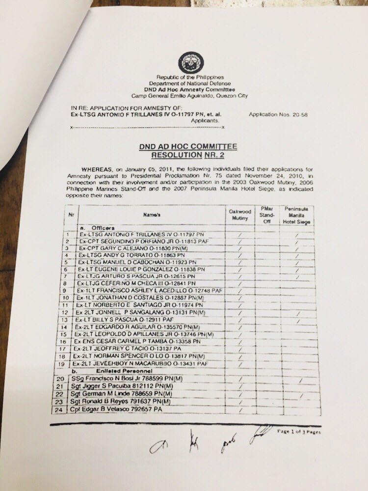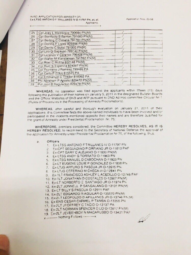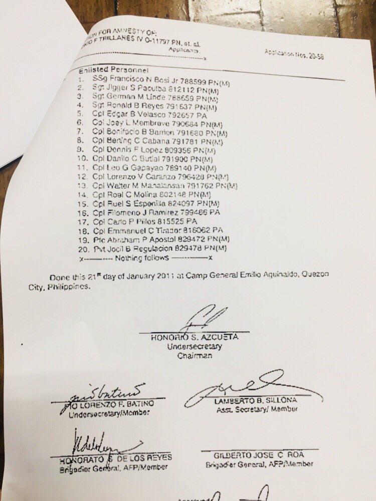The documents, which he said he sourced from his “friends from the Armed Forces of the Philippines,” included what was supposed to be a letter from the then-Defense Secretary Voltaire Gazmin that said the applications of the 38 officers and 53 enlisted personnel for amnesty were “in order,” and a final list of supposed applicants for amnesty as of January 5, 2011, based allegedly on the-then Department of National Defense’s Ad Hoc Amnesty Committee.