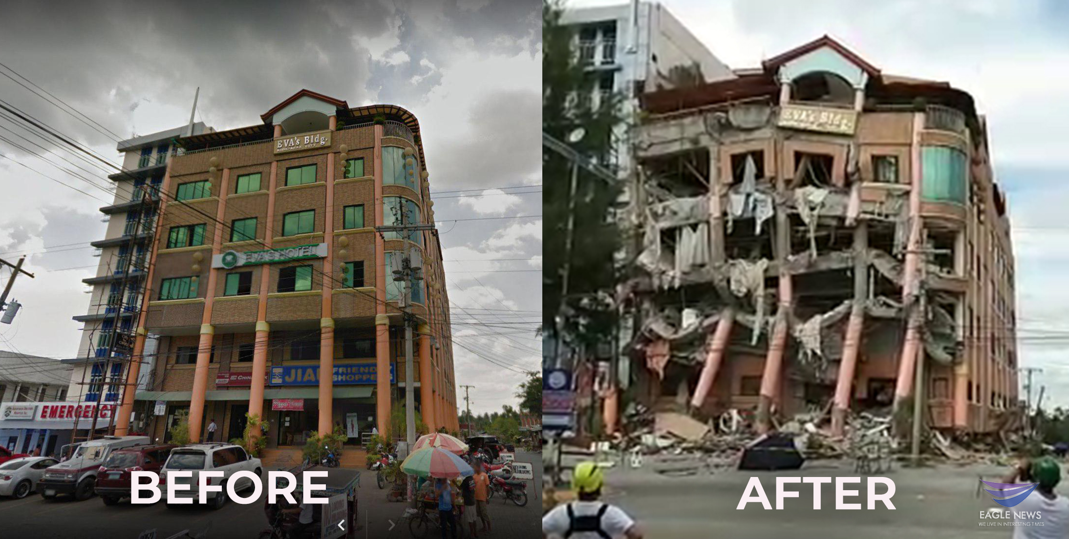 A combination of pictures of Eva’s Hotel in KIdapawan City, Cotabato showing what it looked like before the quake (taken from a Google Streetview of March 2016) and how it was reduced to near-collapse after the series of quakes to rock Cotabato, the latest of which happened on Thursday, Oct. 31, 2019 with a magnitude of 6.5. (Eagle News Service)The Eva Hotel in Kidapawan City, Cotabato is in near collapse after being severely damaged by the series of strong quakes to rock Mindanao, the latest of which occurred on Thursday, Oct. 31, 2019 with a magnitude of 6.5. (Photo by Juvane Hingco, Eagle News Service correspondent in Cotabato)The Eva Hotel in Kidapawan City, Cotabato is in near collapse after being severely damaged by the series of strong quakes to rock Mindanao, the latest of which occurred on Thursday, Oct. 31, 2019 with a magnitude of 6.5. (Photo by Juvane Hingco, Eagle News Service correspondent in Cotabato)