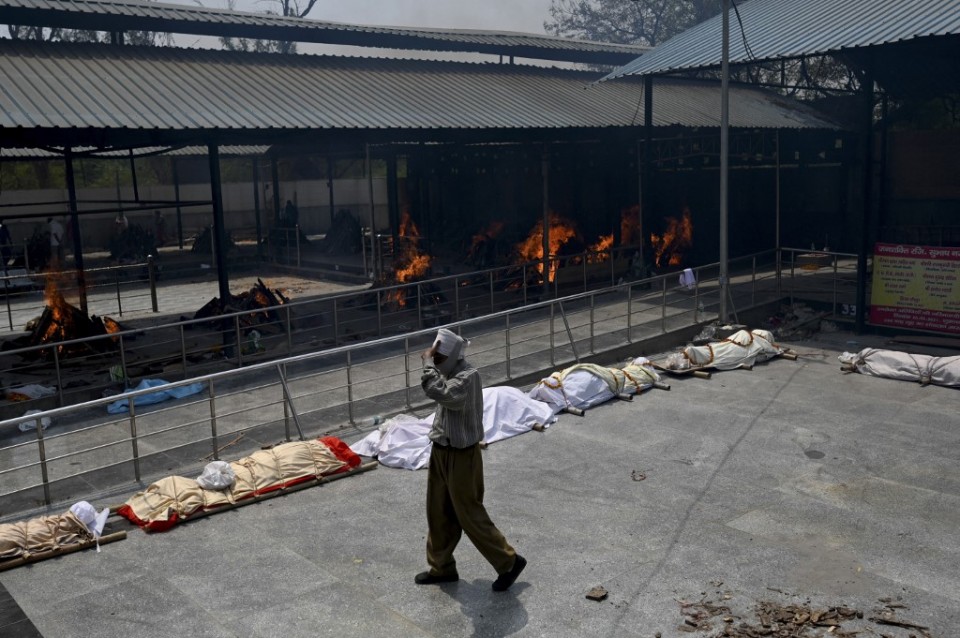 A man walks past bodies of Covid-19 coronavirus victims lined up before cremation at a cremation ground in New Delhi on April 28, 2021. (Photo by Money SHARMA / AFP)