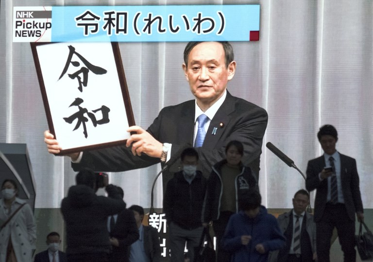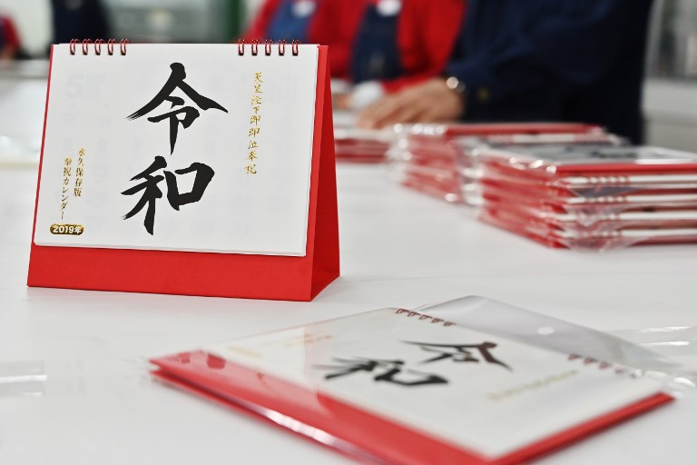 People walk before a screen showing a news program reporting the announcement of Japan’s new era name “Reiwa” in Tokyo, April 1, 2019. – “Reiwa”: Japan on April 1 revealed the name of the era that will define the new emperor’s reign when he ascends the Chrysanthemum Throne next month following a historic abdication. (Photo by Kazuhiro NOGI / AFP)Todan employees pack calendars bearing Japan’s next imperial era name “Reiwa” at a production plant in Ibaraki on April 1, 2019. – “Reiwa”: Japan on April 1 revealed the name of the era that will define the new emperor’s reign when he ascends the Chrysanthemum Throne next month following the first abdication in around 200 years. (Photo by CHARLY TRIBALLEAU / AFP)