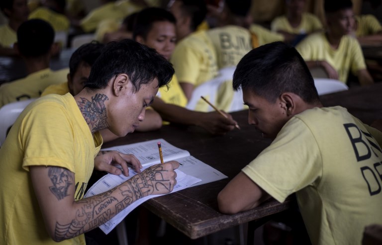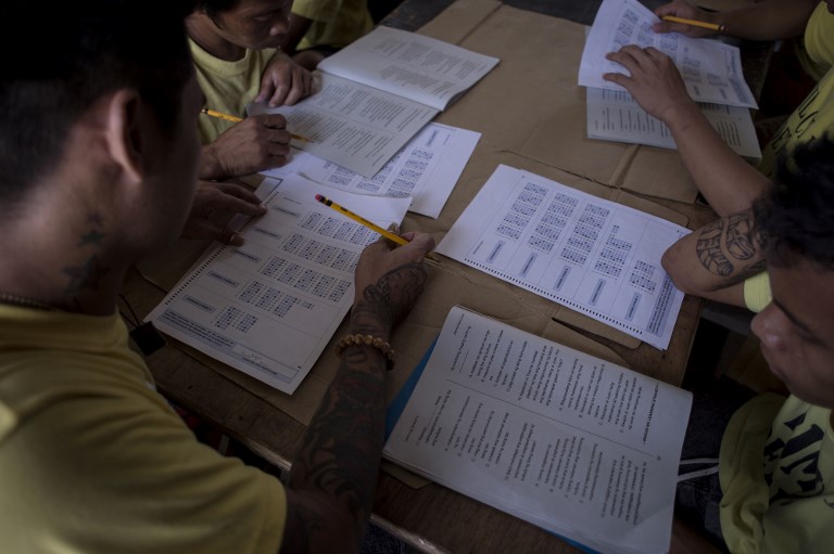 Some 900 inmates, mostly drug related cases, participated in the elementary and highschool exams in the drive to be educated. / AFP PHOTO / NOEL CELIS