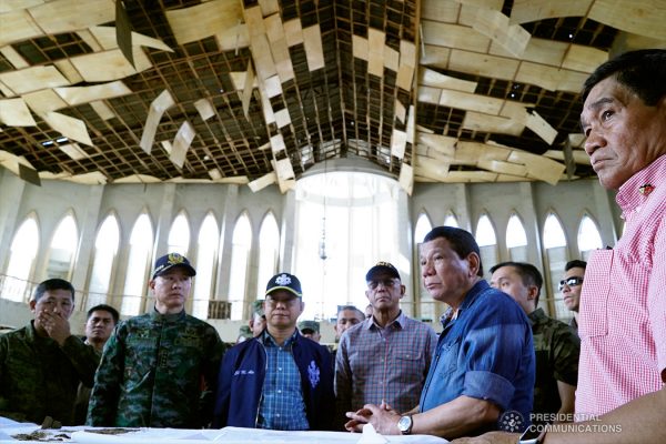 President Rodrigo Duterte conducts an inspection inside the Cathedral of Our Lady of Mount Carmel in Jolo, Sulu on January 28, 2019 where two explosions occurred inside and outside the church last January 27. Accompanying the President are Philippine National Police Director General Oscar Albayalde, Interior and Local Government Secretary Eduardo Año, Defense Secretary Delfin Lorenzana, and National Security Adviser Hermogenes Esperon Jr. KING RODRIGUEZ/PRESIDENTIAL PHOTO