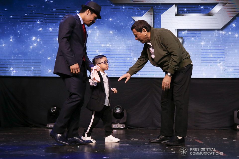 President Rodrigo Duterte poses with Senator Emmanuel Pacquiao and his family during the Senator’s birthday celebration at the KCC Convention and Events Center in General Santos City on December 17, 2018. TOTO LOZANO/PRESIDENTIAL PHOTOPresident Rodrigo Duterte cheerfully greets Senator Emmanuel Pacquiao’s son, Israel, during the Senator’s birthday celebration at the KCC Convention and Events Center in General Santos City on December 17, 2018. TOTO LOZANO/PRESIDENTIAL PHOTO