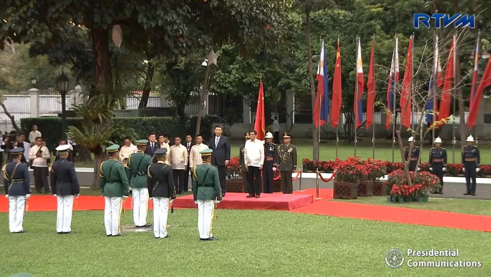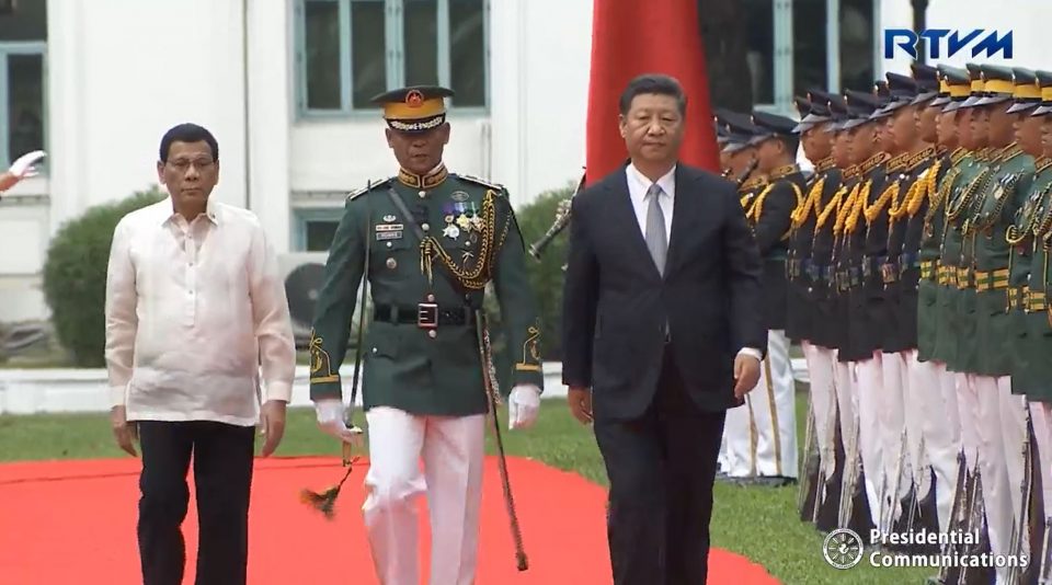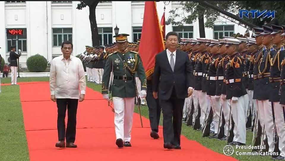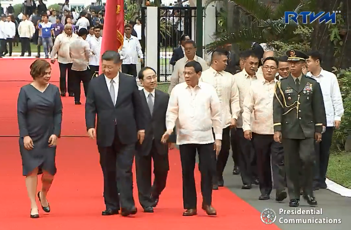 China’s President Xi Jinping and Philippine President Rodrigo Duterte during the welcome ceremony for the Chinese leader’s state visit at the Kalayaan grounds in Malacanang on Tuesday, Nov. 20, 2018. (Photo grabbed from RTVM video)China’s President Xi Jinping and Philippine President Rodrigo Duterte during the welcome ceremony for the Chinese leader’s state visit at the Kalayaan grounds in Malacanang on Tuesday, Nov. 20, 2018. (Photo grabbed from RTVM video)Presidential daughter, Davao City Mayor Sara Duterte walks along with Chinese President Xi Jinping and Philippine President Rodrigo Duterte during the welcome ceremony at the Malacanang grounds for the Chinese leader on Tuesday, Nov. 11, 2018. (Photo grabbed from RTVM video)China’s President Xi Jinping and Philippine President Rodrigo Duterte during the welcome ceremony for the Chinese leader’s state visit at the Kalayaan grounds in Malacanang on Tuesday, Nov. 20, 2018. (Photo grabbed from RTVM video)