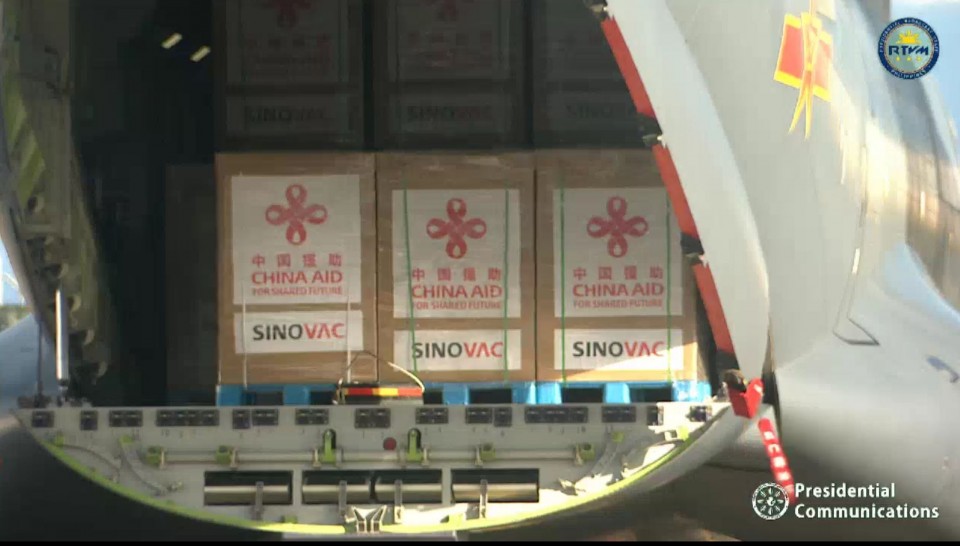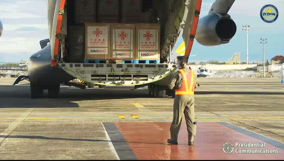 The vaccines from Sinovac Biotech Ltd. arrived in the Philippines onboard a Chinese military plane at the Villamor Air Base (VAB) in Pasay City on February 28.