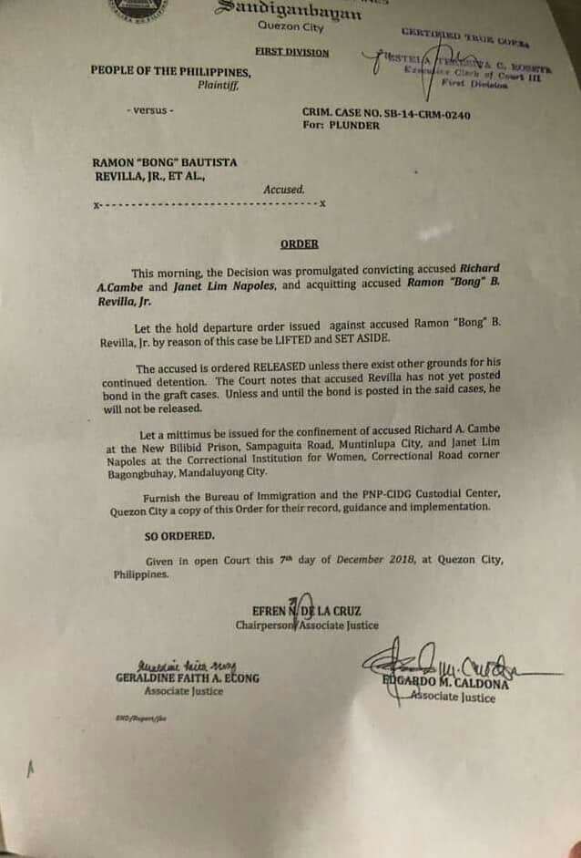 The division issued the same after Revilla was acquitted of plunder, and after he posted a P480,000 bail for the 16 counts of graft against him.