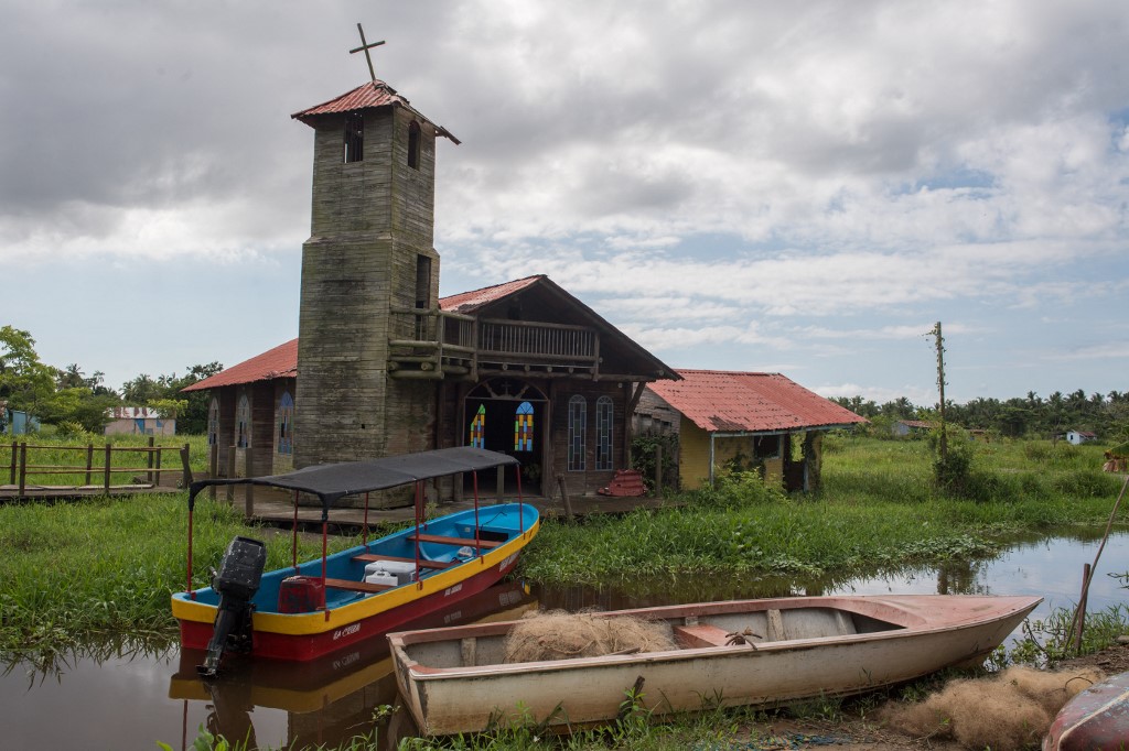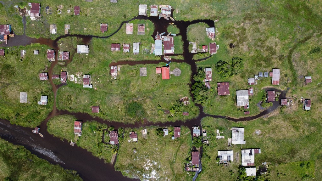 An aerial view of the village captured by a camera drone leaves the false impression that Congo Mirador exists in the middle of a lush green field — in fact, it’s a swamp and life is increasingly difficult.