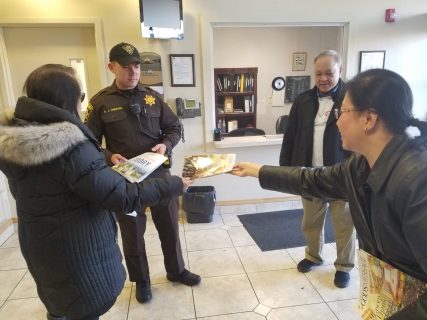 Members of the Iglesia Ni Cristo in Waldorf, Maryland give gift baskets to the county sheriff.