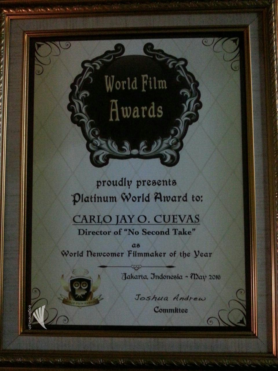 The Platinum World Award was given to “Walang Take Two” director Carlo Jay Cuevas as “World Newcomer Filmmaker of the year” last night. Aside from this, the film bagged the Golden World Award for “International Film.”