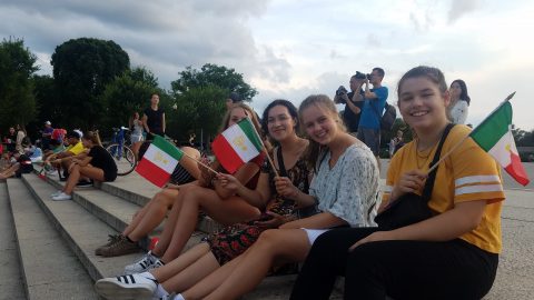 European exchange students sit on the steps of the Lincoln Memorial as they enjoy Christian Music during INC’s INConcert event. Photo by Dexter Manglicmot, EBC Washington D.C. Bureau.