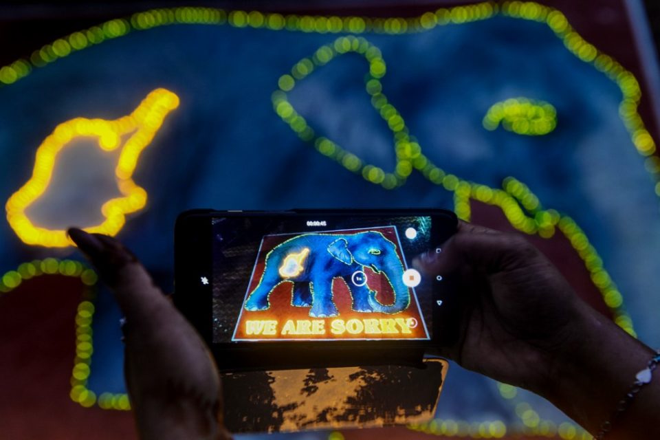 A woman takes a picture with her mobile phone of a painted poster of an elephant and its calf in the belly lit up with candles by school staff to pay homage after the recent killing of a pregnant wild elephant in the southern Indian state of Kerala, in Chennai on June 6, 2020. (Photo by Arun SANKAR / AFP)