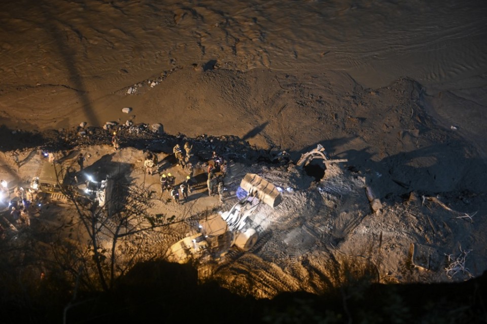 With the main road washed away, paramilitary rescuers had been forced to scale down a hillside on ropes to reach the entrance. Emergency workers were using heavy machinery to remove tonnes of rocks.
