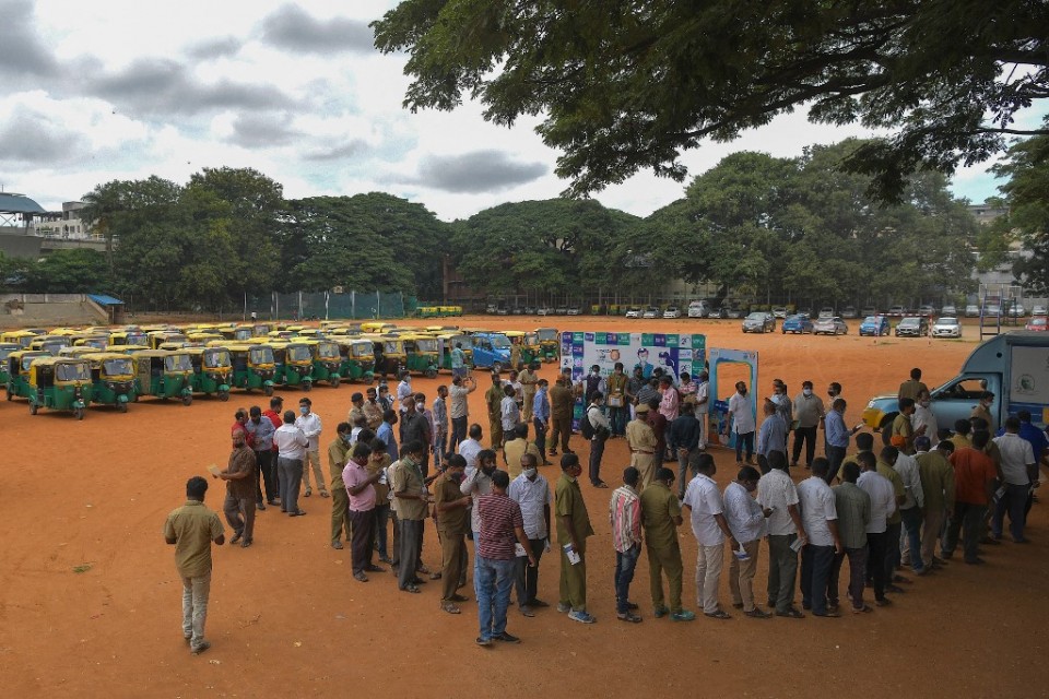 An auto rickshaw drivers queue up to get themselves inoculated with the jab of CoviShield vaccine against the Covid-19 coronavirus during a free vaccination drive in Bangalore on August 25, 2021. (Photo by Manjunath Kiran / AFP)