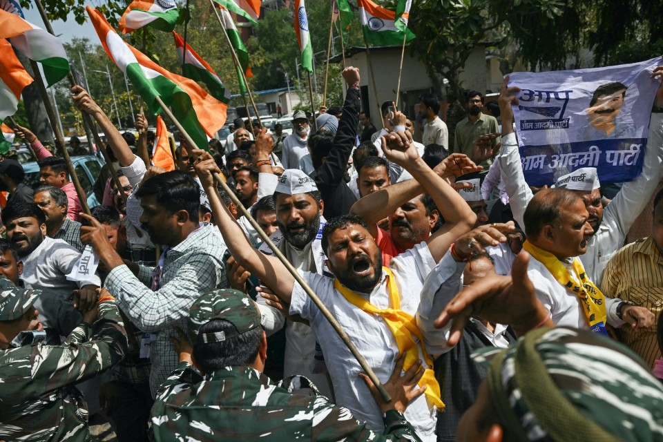 Many in the flag-waving crowd were supporters of Kejriwal’s Aam Aadmi Party (AAP), or Common Man Party, who donned yellow tops with the image of their leader in jail.