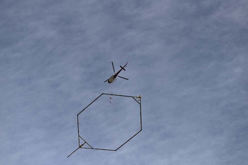 A helicopter equipped with a surface penetrating high definition camera hovers over Tapovan tunnel, where workers are trapped, in Chamoli district on February 9, 2021 following a flash flood thought to have been caused when a glacier burst on February 7. (Photo by Sajjad HUSSAIN / AFP)