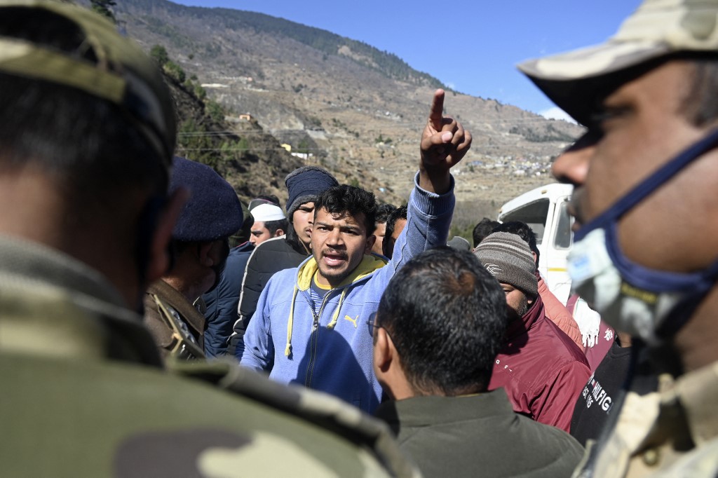Family members of the people trapped in a tunnel after the flash floods shout slogans to protest alleging slow pace of rescue operation in Tapovan, Chamoli district, on February 10, 2021. (Photo by Sajjad HUSSAIN / AFP)