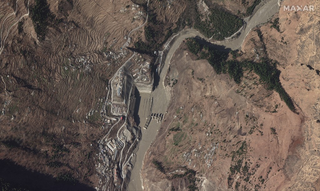 This handout satellite image released by Maxar Technologies shows the aftermath of the February 7, 2021 glacial collapse and flash flood that struck northern India along the Dhauliganga River in the Uttarakhand region on February 10, 2021. – Dozens of angry and desperate relatives of about 30 people trapped in a tunnel since a glacier disaster in India jostled with police on Wednesday as hopes faded that they would be found alive.More than 170 people were still missing after a barrage of water and debris hurtled down a valley with terrifying speed and power on Sunday morning, sweeping away bridges and roads and hitting two hydroelectric plants. (Photo by Handout / Satellite image ©2021 Maxar Technologies / AFP)