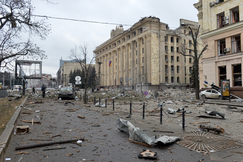On Tuesday the central square of the city near the Russian border was shelled by advancing forces who hit the building of the local administration, regional governor Oleg Sinegubov said.