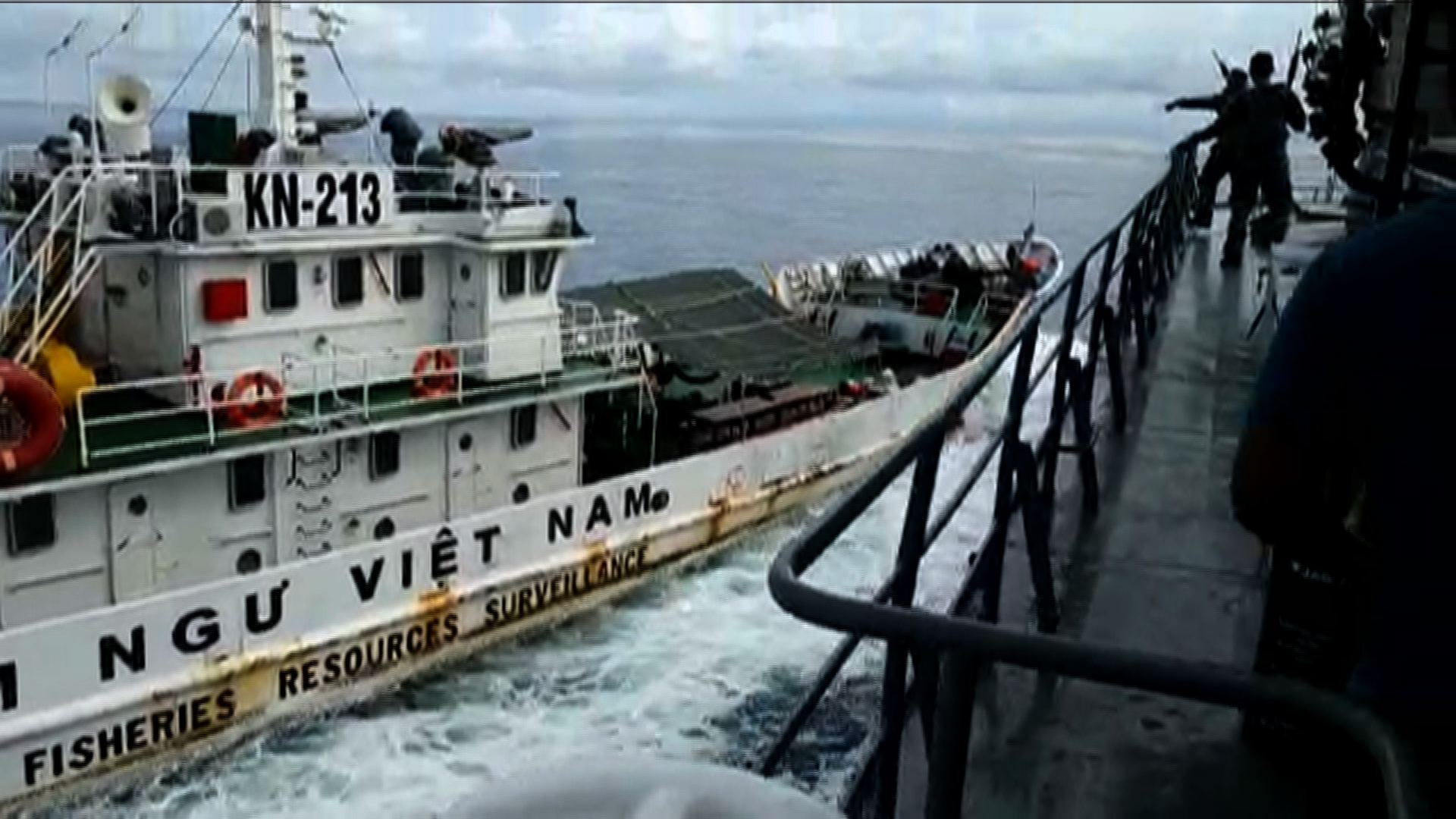Video circulating on social media purported to show a Vietnamese patrol boat ramming the left side of the Indonesian vessel as the armed navy crew shouted expletives.