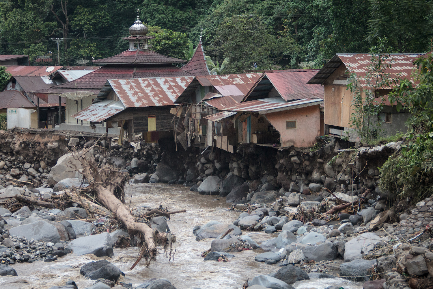 Heavy rains inundated neighbourhoods with muddy flood waters and swept vehicles into a nearby river, while volcanic ash and large rocks rumbled down Mount Marapi.