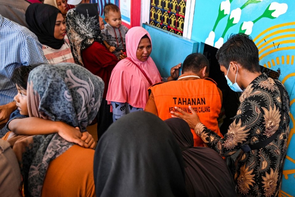Relatives say goodbye to a man (R-in orange) as he is sent to prison, after a court found nearly a dozen men guilty in Calang, Aceh province on January 27, 2022, for the 2020 killing of five critically endangered Sumatran elephants by electrocution and then peddling their lucrative tusks. (Photo by CHAIDEER MAHYUDDIN / AFP)