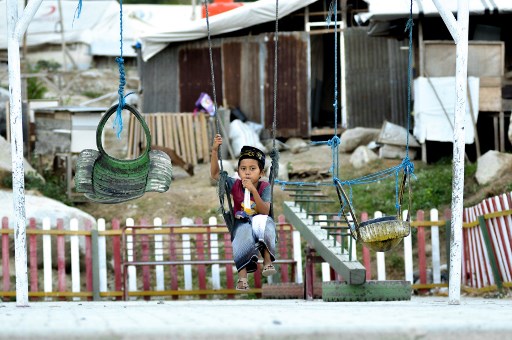 This picture taken on September 25, 2019 shows 9-year-old Rafi Adit Putra sitting on a swing near his living place, a temporary shelter, in Palu, Central Sulawesi, a year after the magnitude 7.5 quake and subsequent deluge razed swathes of the coastal city killing more than 4,300 people and displacing some 170,000 residents. – Indonesia on September 28, 2019 marks one year since a devastating quake-tsunami disaster that pounded the city of Palu, killing more than 4,000 people. (Photo by OLAGONDRONK / AFP)