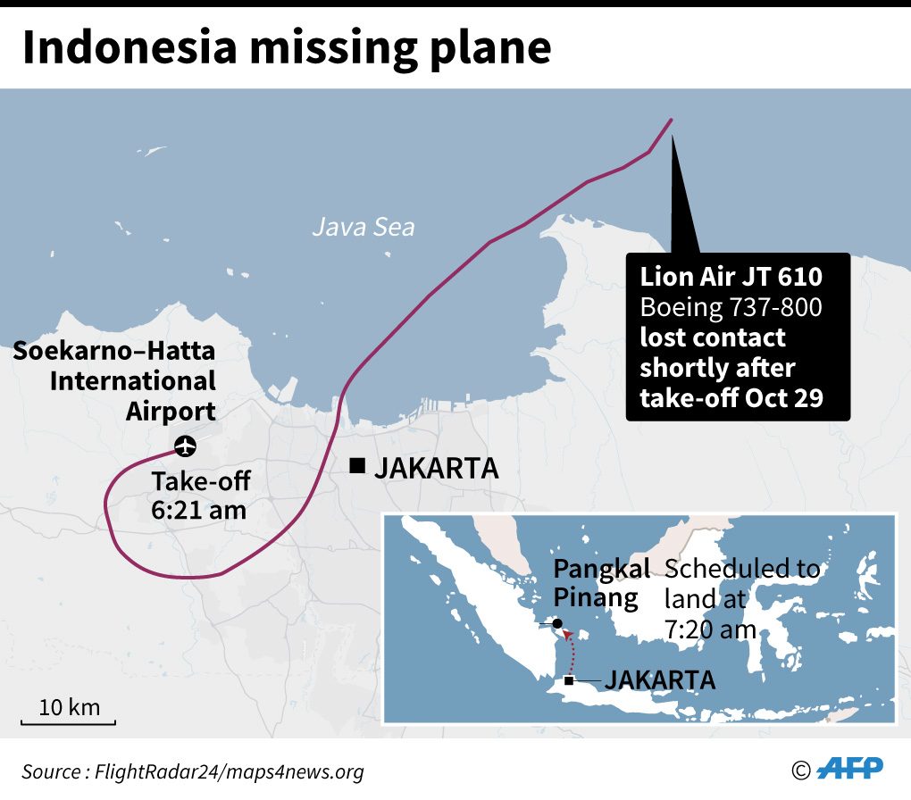 JAKARTA, Indonesia (AFP) — An Indonesian Lion Air plane carrying 188 passengers and crew crashed into the sea Monday, officials said, moments after it had asked to be allowed to return to Jakarta.