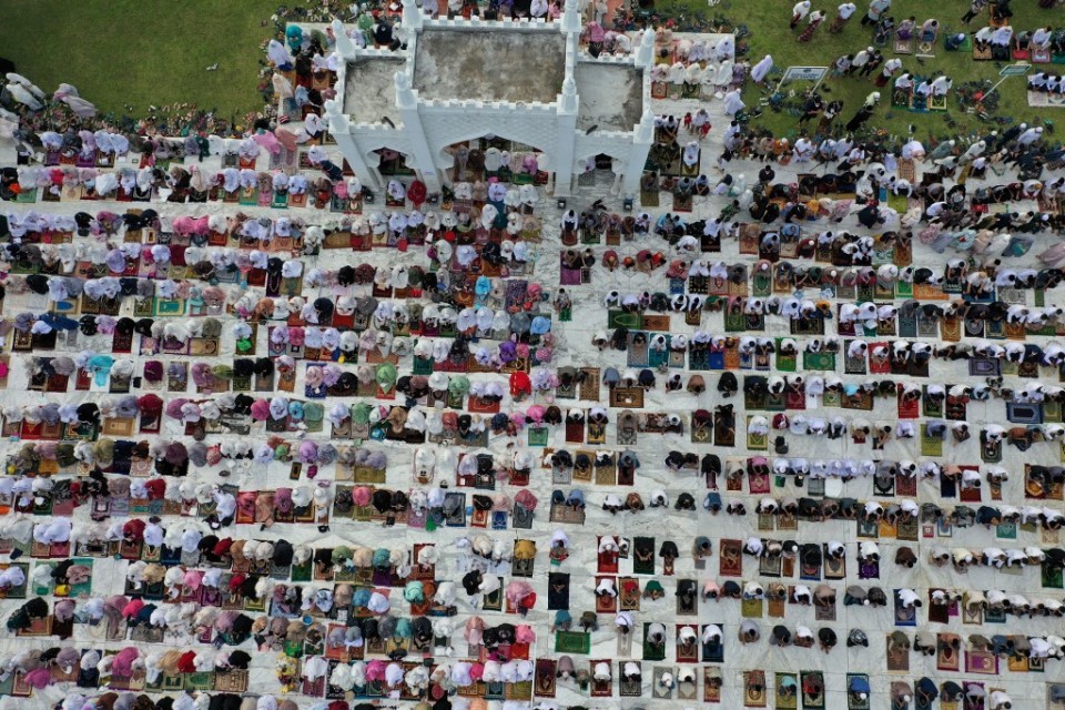 Thousands of others in Banda Aceh assembled in close quarters outside the Baiturrahman Grand Mosque, where vendors hawked animal-shaped balloons to families.