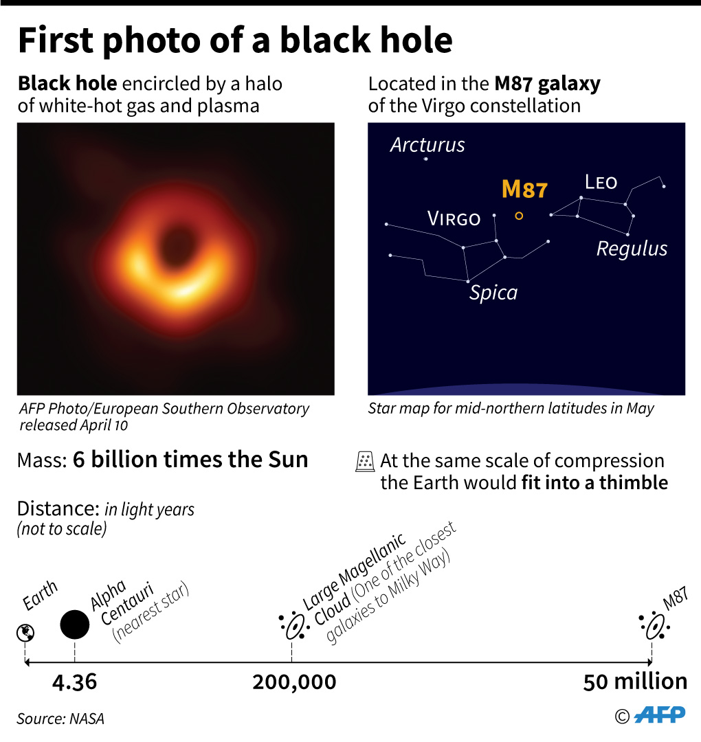 This infographic from AFP shows the first photograph of a black hole located in the M87 galaxy in the Virgo constellation, 50 billion lights years from Earth.