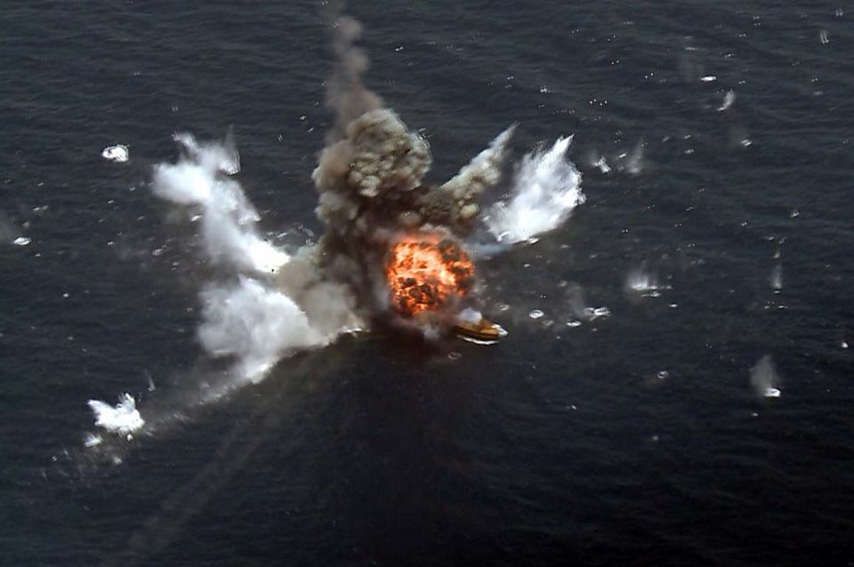 The armed forces’ website published pictures of the drill in the Gulf of Oman showing missiles being fired from a warship and the back of a truck, and a vessel exploding out at sea.
