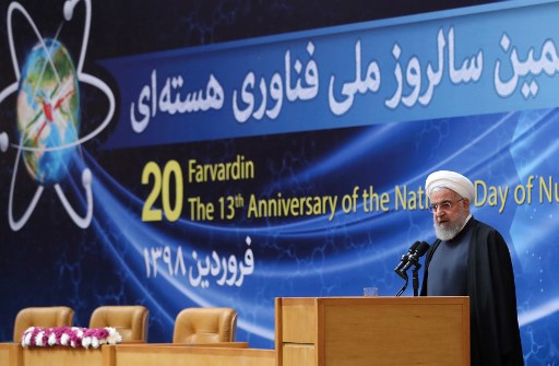 A handout picture made available by the Iranian presidential office shows, Iranian President Hassan Rouhani delivering a speech during the “nuclear technology day” in Tehran on April 9, 2019. – Rouhani said that the United States was the real “leader of world terrorism” after Washington blacklisted Iran’s Revolutionary Guards as a “foreign terrorist organisation”. “Who are you to label revolutionary institutions as terrorists?” Rouhani asked in a speech broadcast live by state television. “You want to use terrorist groups as tools against the nations of the region… you are the leader of world terrorism,” he said. (Photo by HO / Iranian Presidency / AFP)