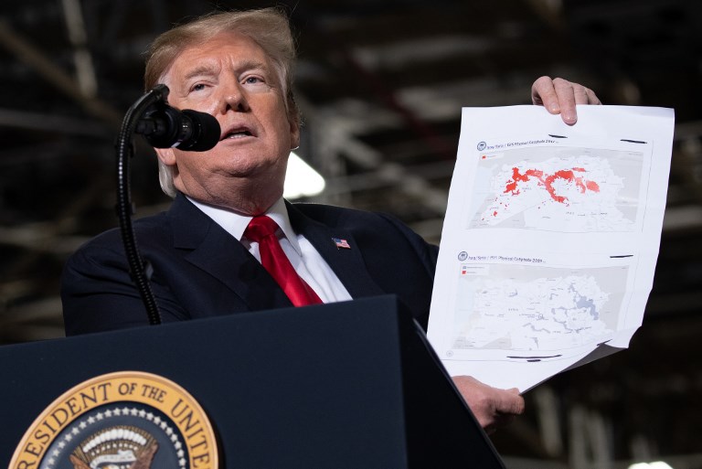 He showed off maps that illustrate the dramatic shrinking of territory held by the jihadist group in the period from his election in 2016 and now.
