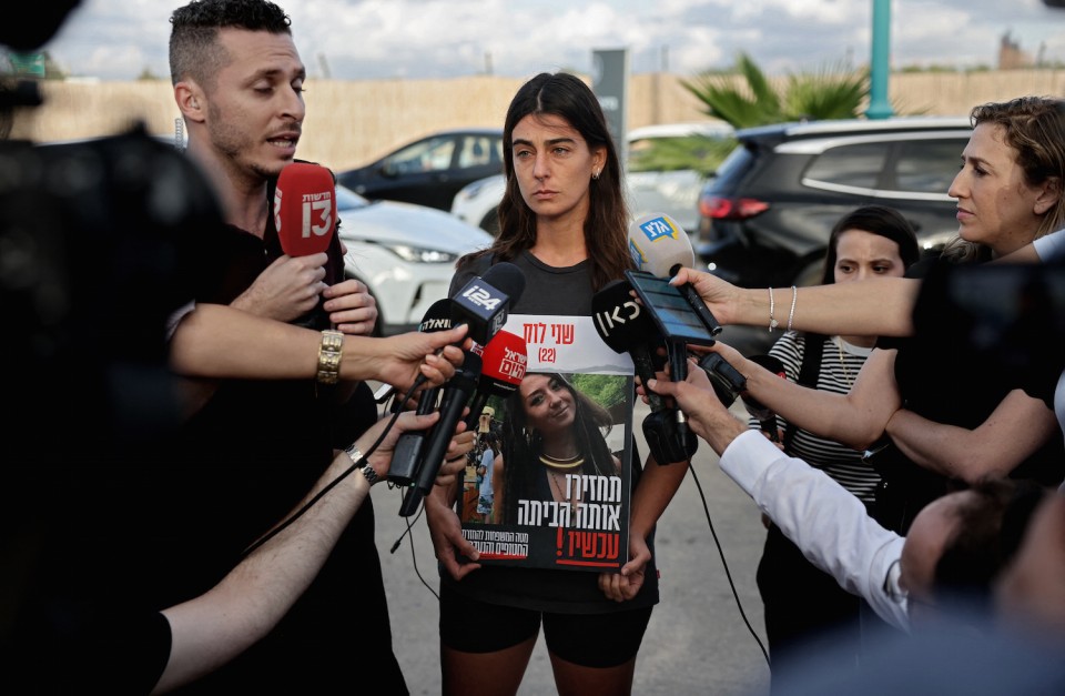 The cousin of Shani Nicole Louk, one of the Israeli hostages snatched by the Palestinian militant group Hamas last week in a surprise attack on Israel, speaks to journalists after a meeting with Israeli Prime Minister Benjamin Netanyahu at the army base in Ramla on October 15, 2023. (Photo by Thomas COEX / AFP)