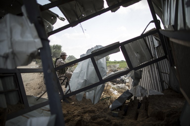 Israel targeted Hamas positions in the Gaza Strip by air and with tank fire on August 21, 2016 after a rocket fired from the Palestinian enclave crashed into the Israeli city of Sderot. Palestinian security sources in the territory said several targets in northen Gaza were struck by Israeli fire, and that a reservoir in Beit Hanun was destroyed. Witnesses said a base of Hamas’s military wing the Ezzedine Al-Qassam Brigades, in nearby Beit Lahia, was also hit. / AFP PHOTO / MAHMUD HAMS