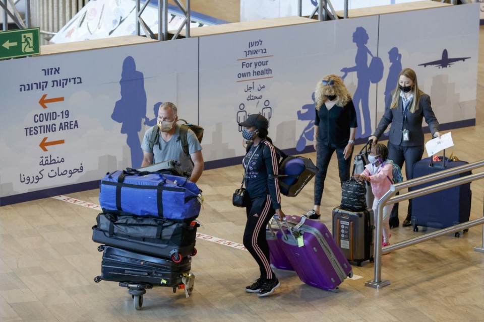 Israelis and vaccinated tourists wearing masks for COVID-19 protection arrive to Israel’s Ben Gurion Airport near Tel Aviv on May 23, 2021, after a partial re-opening of the border to inoculated tourists from 14 countries. (Photo by JACK GUEZ / AFP)