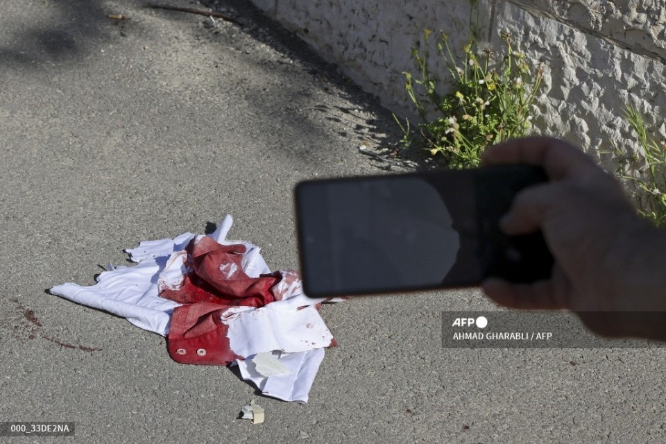 A man takes a picture with his smart phone of a blood-stained torn shirt left on the ground following a shooting attack in the Palestinian neighbourhood of Sheikh Jarrah in annexed east Jerusalem, on April 18, 2023. – A suspected Palestinian gunman wounded two men near a Jewish site in annexed east Jerusalem, Israeli authorities said, with security forces conducting a manhunt for the perpetrator. (Photo by AHMAD GHARABLI / AFP)