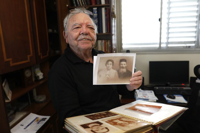 Samy Gryn, 78, French -Israeli Holocaust survivor, shows an old picture of his relatives during an interview with AFP in the coastal city of Tel Aviv on February 25, 2019. – Anti-Semitic acts in France rose by 74 percent in 2018, according to government data. The country “seems to be facing a resurgence of anti-Semitism unseen since World War II,” French President Emmanuel Macron said last month (Photo by MENAHEM KAHANA / AFP)