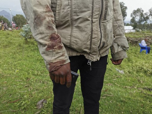 A man who tried to help the wounded driver of the Italian Ambassador to the DRCOngo Luca Attanasio wears a blood stained jacket as he standsnear the road in the Kibumba area in the Virunga National Park, 25km from Goma, on February 22, 2021, where Italy’s ambassador to the Democratic Republic of Congo was killed earlier when a UN convoy came under attack. – Luca Attanasio died of his wounds after a World Food Programme (WFP) convoy came under fire near Goma while he was on a field trip to the region. (Photo by ALEXIS HUGUET / AFP)