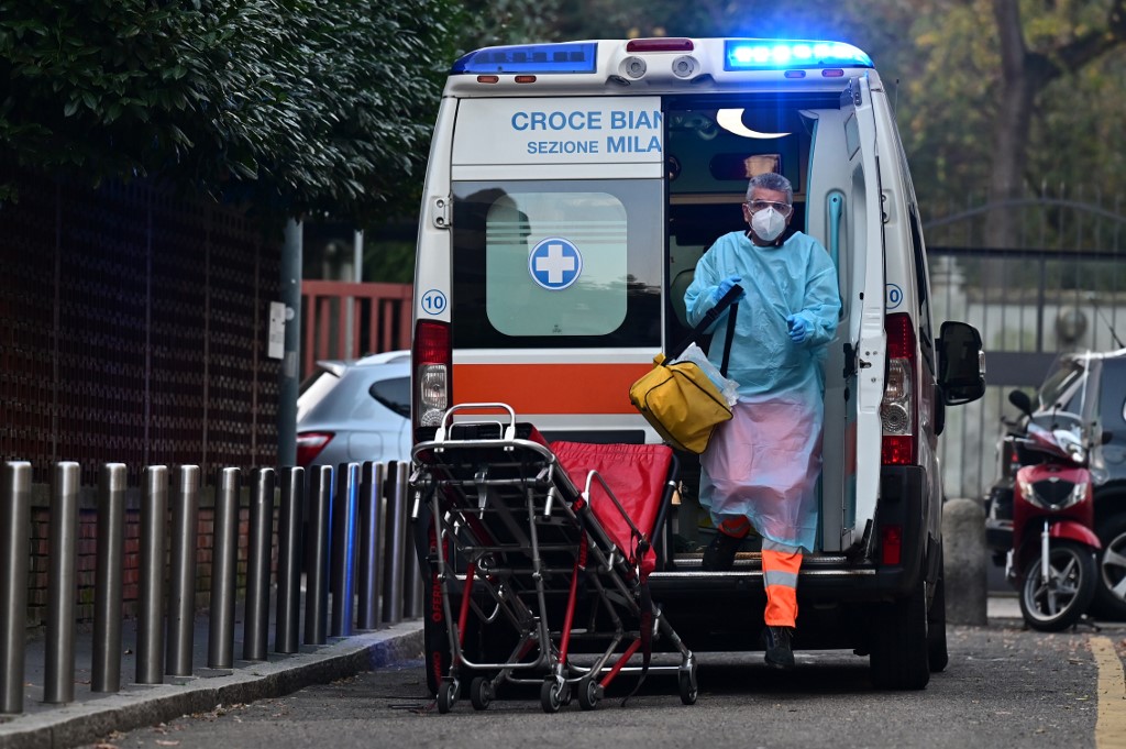 An emergency worker of the Italian Voluntary Association of First Aid and Public Assistance “Croce Bianca” arrives to take care of a Covid-19 patient after an emergency call in Milan on November 9, 2020. (Photo by Miguel MEDINA / AFP)