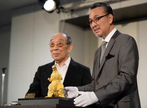 Japanese actors Akira Takarada (R) and Haruo Nakajima (L) pose beside the 24-centimeter-tall and 15-kilogram gold statue of Godzilla unveiled during a press preview of the Godzilla exhibition in Tokyo on July 19, 2014. /AFP/Toshifumi Kitamura/