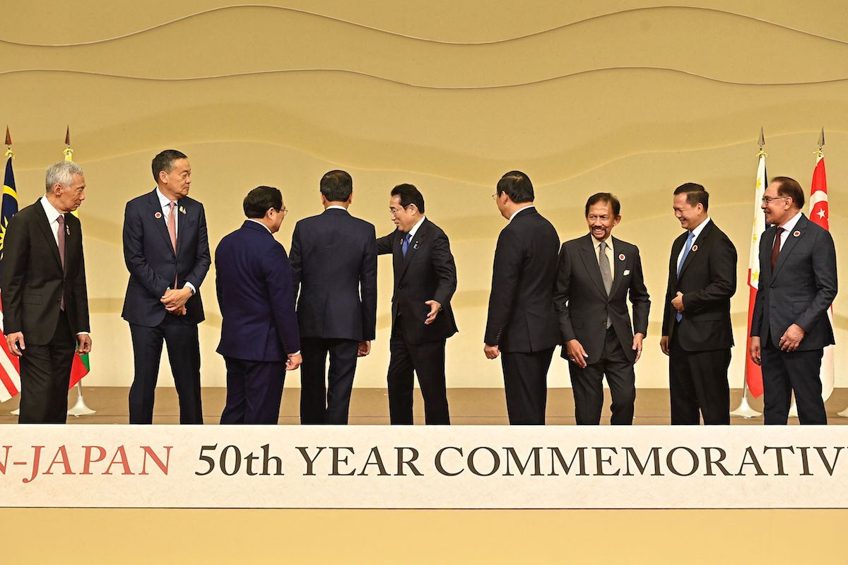 From L-R: Leaders of ASEAN-member nations Singapore’s Prime Minister Lee Hsien Loong, Thailand Prime Minister Srettha Thavisin, Vietnam’s Prime Minister Pham Minh Chinh, Indonesian President Joko Widodo, Japanese Prime Minister Fumio Kishida, Laos’s Prime Minister Sonexay Siphandone, Brunei’s Sultan Hassanal Bolkiah and Prince Abdul Mateen, Cambodia’s Prime Minister Hun Mamet, Malaysia’s Prime Minister Anwar Ibrahim prepare for a group photo prior to their talks session of the Japan-ASEAN Friendship and Synergy 50th anniversary Special Personal Consultant Talks in Tokyo on December 17, 2023. (Photo by David Mareuil / POOL / AFP)