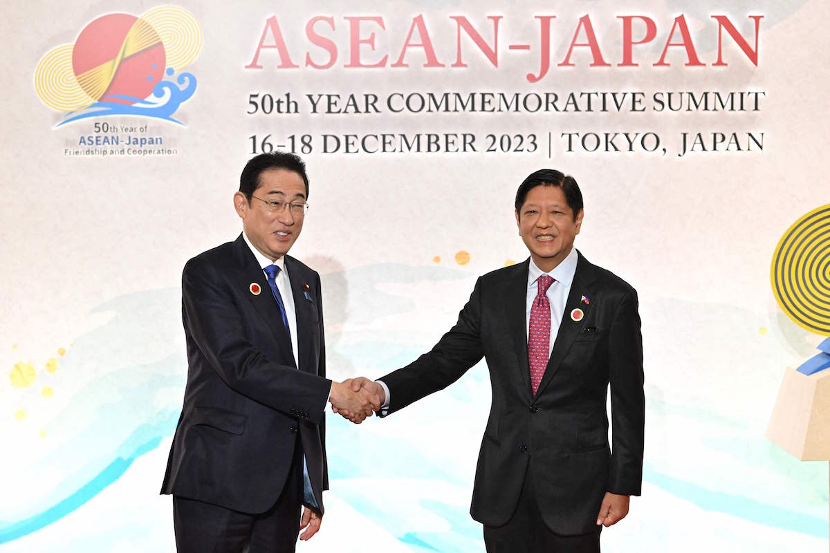 Japan’s Prime Minister Fumio Kishida (L) greets Philippines’ President Ferdinand Marcos Jr. upon arrival for the opening session of ASEAN-Japan Commemorative Summit Meeting at the Hotel Okura Tokyo in Tokyo on December 17, 2023. (Photo by Kazuhiro NOGI / POOL / AFP)