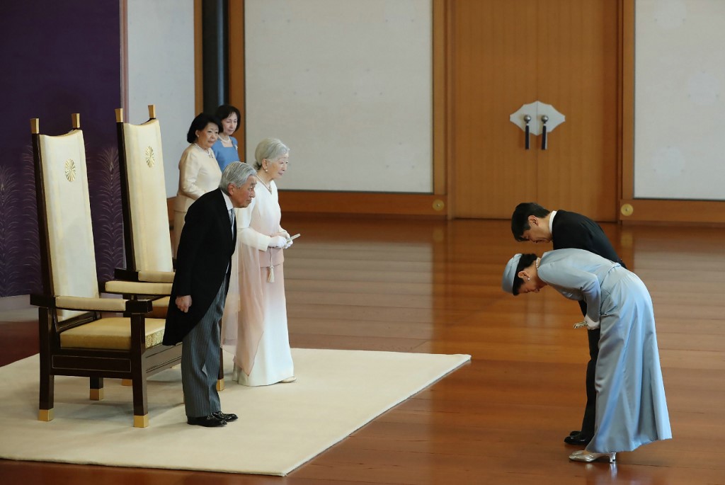 (FILES) In this file photo taken on February 24, 2019 Japan’s Emperor Akihito (L) and Empress Michiko (2nd L) receive the greetings of Crown Prince Naruhito (top R) and Crown Princess Masako (lower R) as part of the ceremony marking the 30th anniversary of Emperor Akihito’s enthronement at the Matsu-no-Ma hall(Room of Pine) of the Imperial Palace in Tokyo. – Japan has waited more than two centuries for an emperor to abdicate but the main ceremony to perform the ritual will take a mere 10 minutes. The solemn rite will take place at precisely 5:00pm local time on April 30 in the 370-square-metre “Matsu-no-Ma” (Room of Pine), considered the most elegant hall in the sumptuous Imperial Palace. (Photo by JAPAN POOL VIA JIJI PRESS / POOL / AFP) /