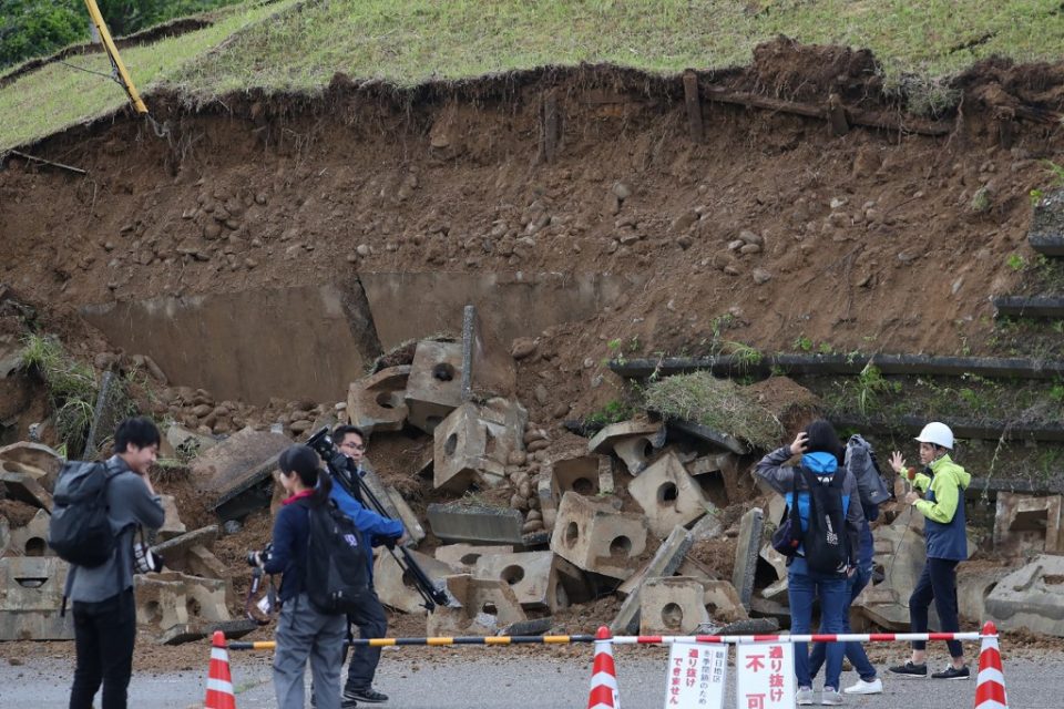 NHK aired footage showing an elementary school ceiling collapsing onto the ground, and small scale landslides in some towns and near railways.