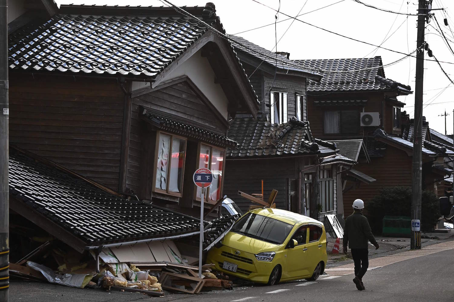 Collapsed wooden houses are seen in Wajima, Ishikawa prefecture on January 2, 2024, a day after a major 7.5 magnitude earthquake struck the Noto region in Ishikawa prefecture in the afternoon. Japanese rescuers battled against the clock and powerful aftershocks on January 2 to find survivors of a major earthquake that struck on New Year’s Day, reportedly killing more than 20 people and leaving a trail of destruction. (Photo by Kazuhiro NOGI / AFP)