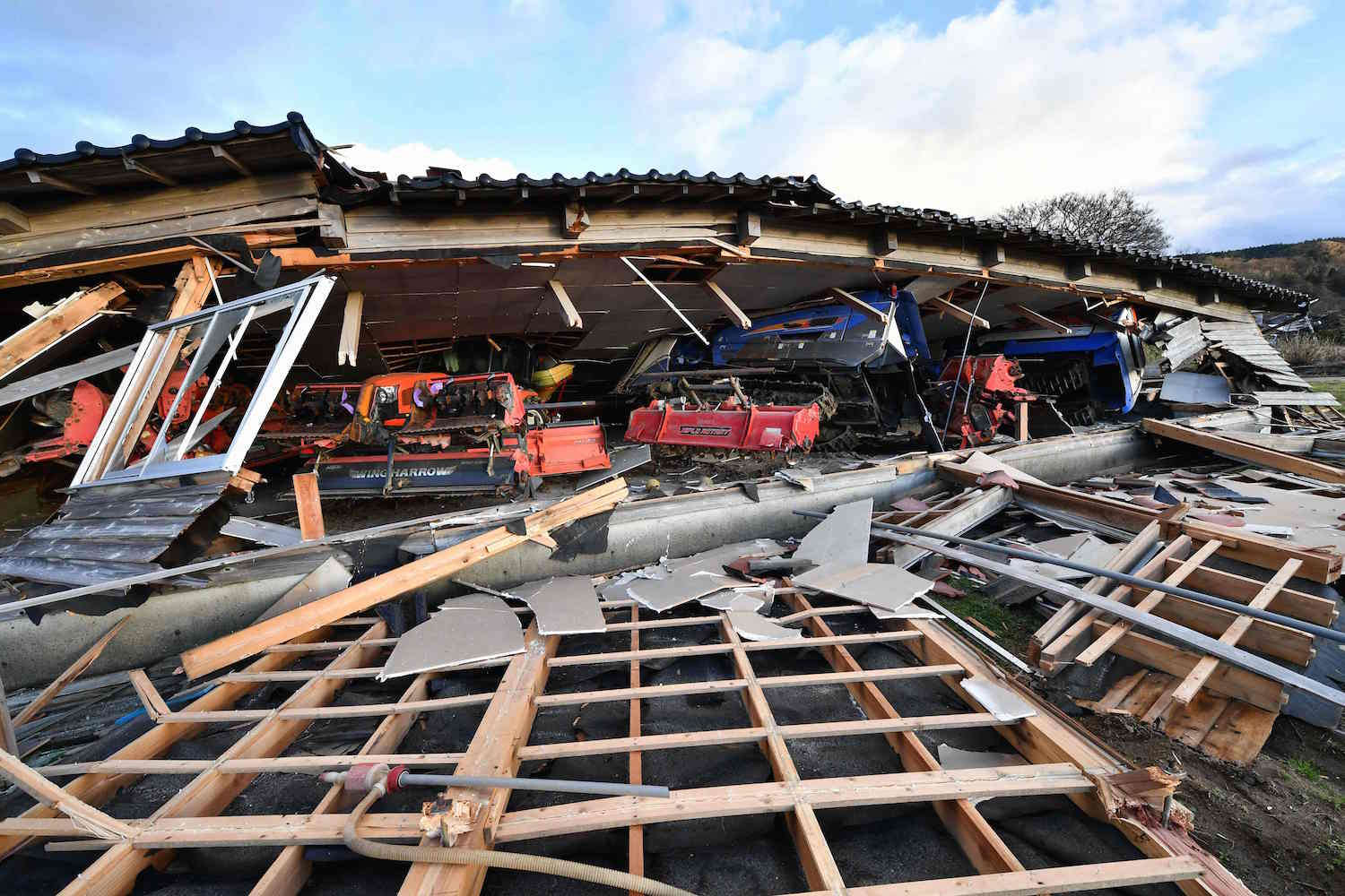 TOPSHOT – Agricultural machinery and other equipment are seen trapped under a collapsed wooden house in Wajima, Ishikawa prefecture on January 2, 2024, a day after a major 7.5 magnitude earthquake struck the Noto region in Ishikawa prefecture in the afternoon. Japanese rescuers battled against the clock and powerful aftershocks on January 2 to find survivors of a major earthquake that struck on New Year’s Day, reportedly killing more than 20 people and leaving a trail of destruction. (Photo by Kazuhiro NOGI / AFP)