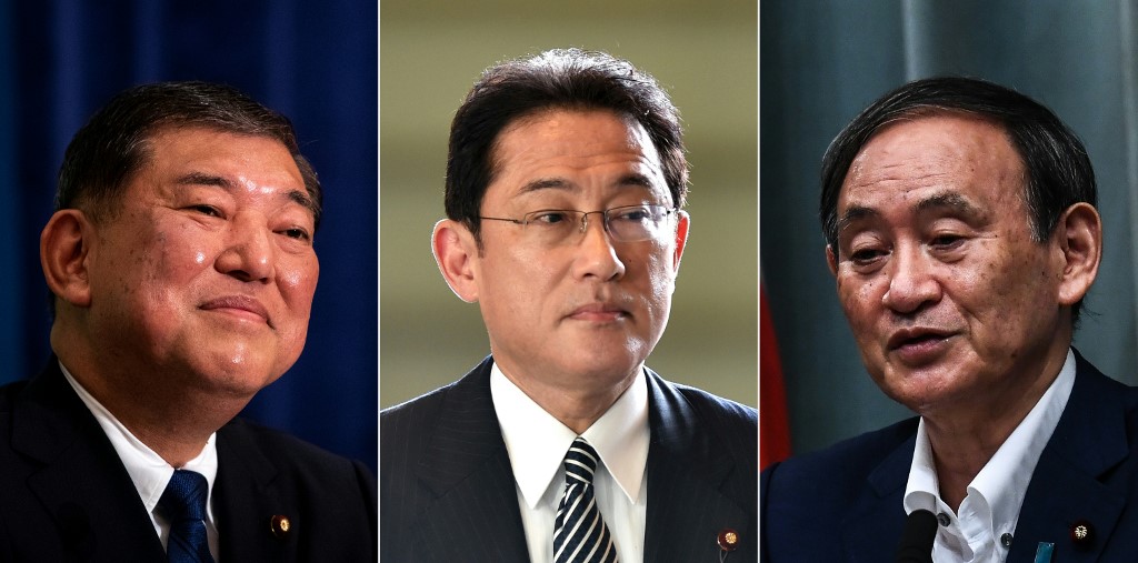 Japan’s Liberal Democratic Party member Shigeru Ishiba on September 14, 2018, Liberal Democratic Party member Fumio Kishida on August 3, 2017 and Japan’s chief cabinet secretary Yoshihide Suga on August 31, 2020 who are contenders to replace Shinzo Abe after announcing his resignation as the country’s prime minister. (Photo by AFP)